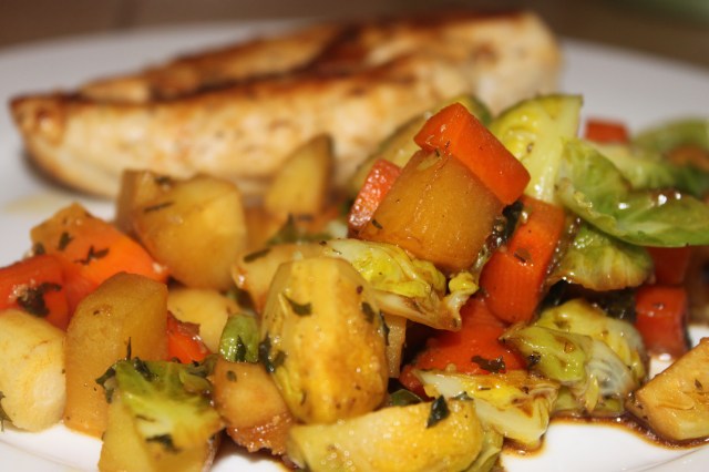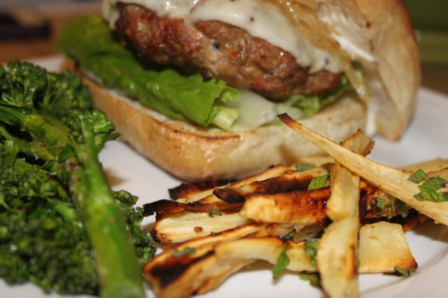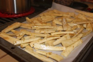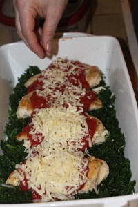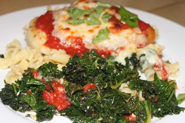 Tonight we made Williams Sonoma’s chicken parmesan, baked on a bed of kale. It was pretty easy to make and turned out very tasty. And guess what? We discovered that we love kale! We followed the recipe pretty closely, but we added a tablespoon of minced garlic to the kale while it was wilting on the stove top.