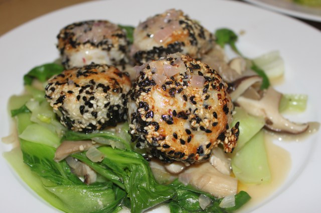 What an adventure this meal was! I have never made scallops before and they turned out pretty well! I followed Emeril’s sauteed bok choy and shiitake mushrooms with seared sesame-crusted scallops and ginger butter to a tee — but with less butter.