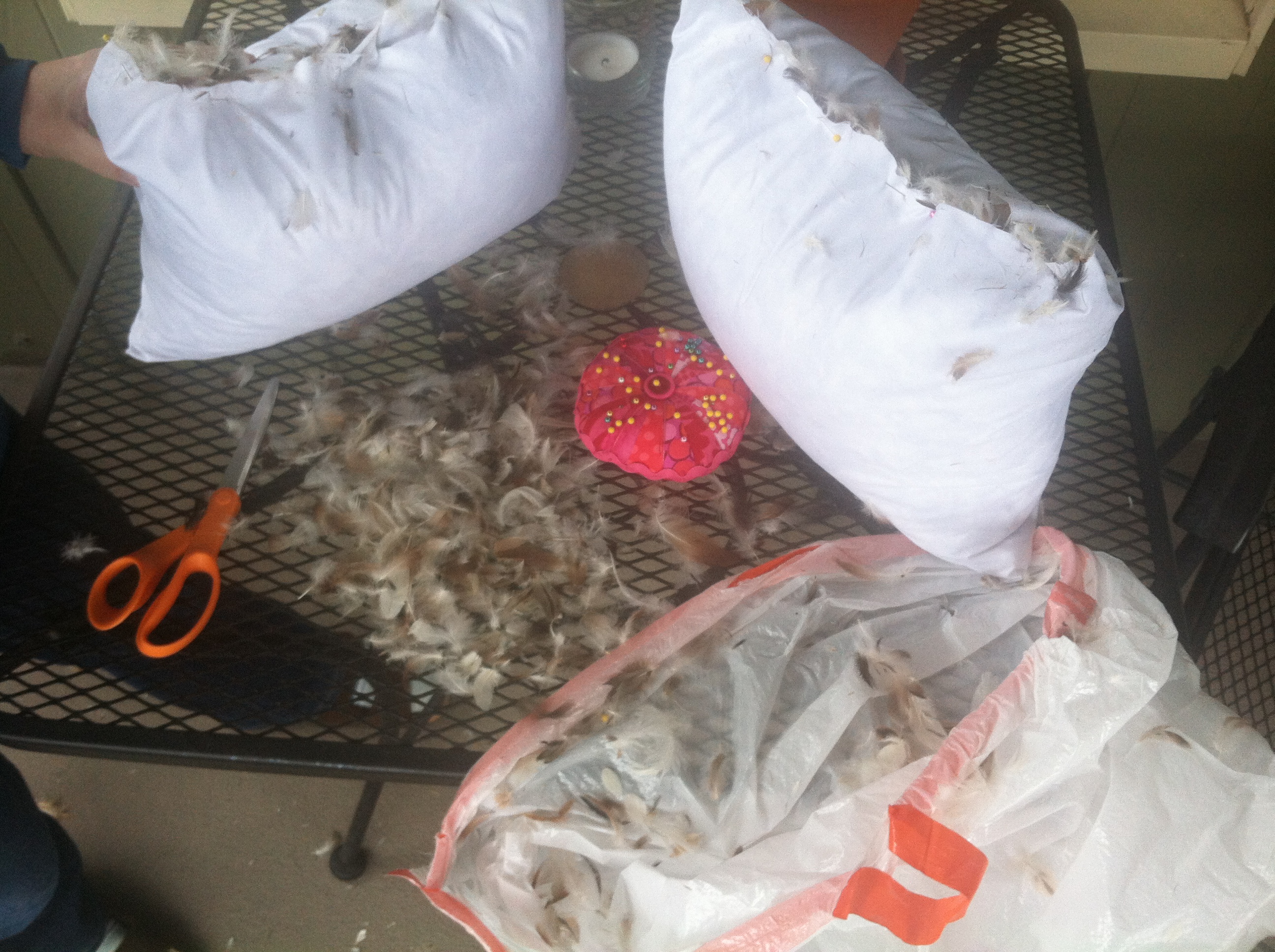 Cutting and sewing the pillow case was the easiest part. We literally cut it in half, including the zipper and then sewed it back together. The actual feather pillow was a different story. We started off inside and quickly moved out to the deck. Turns out there are a ton of feathers in a feather pillow and cutting a pillow in half creates quite the mess. We grabbed a few garbage bags and started removing some of the feathers, and kept cutting. Here’s a photo mid-way through. We were skeptical of the cut and sew plans and were ready to call this a DIY Fail. It was a particularly windy day and many of the extra feathers literally took flight. It looked like we killed a few birds on the porch.