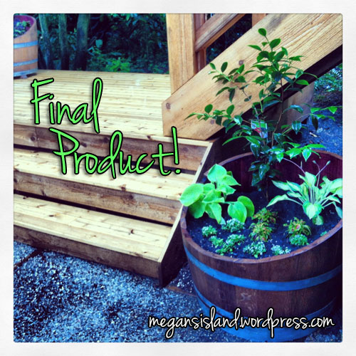 This is what the barrels looks like half stained. I kind of like the two-tone look. Maybe for the next round of barrel planters that I make!