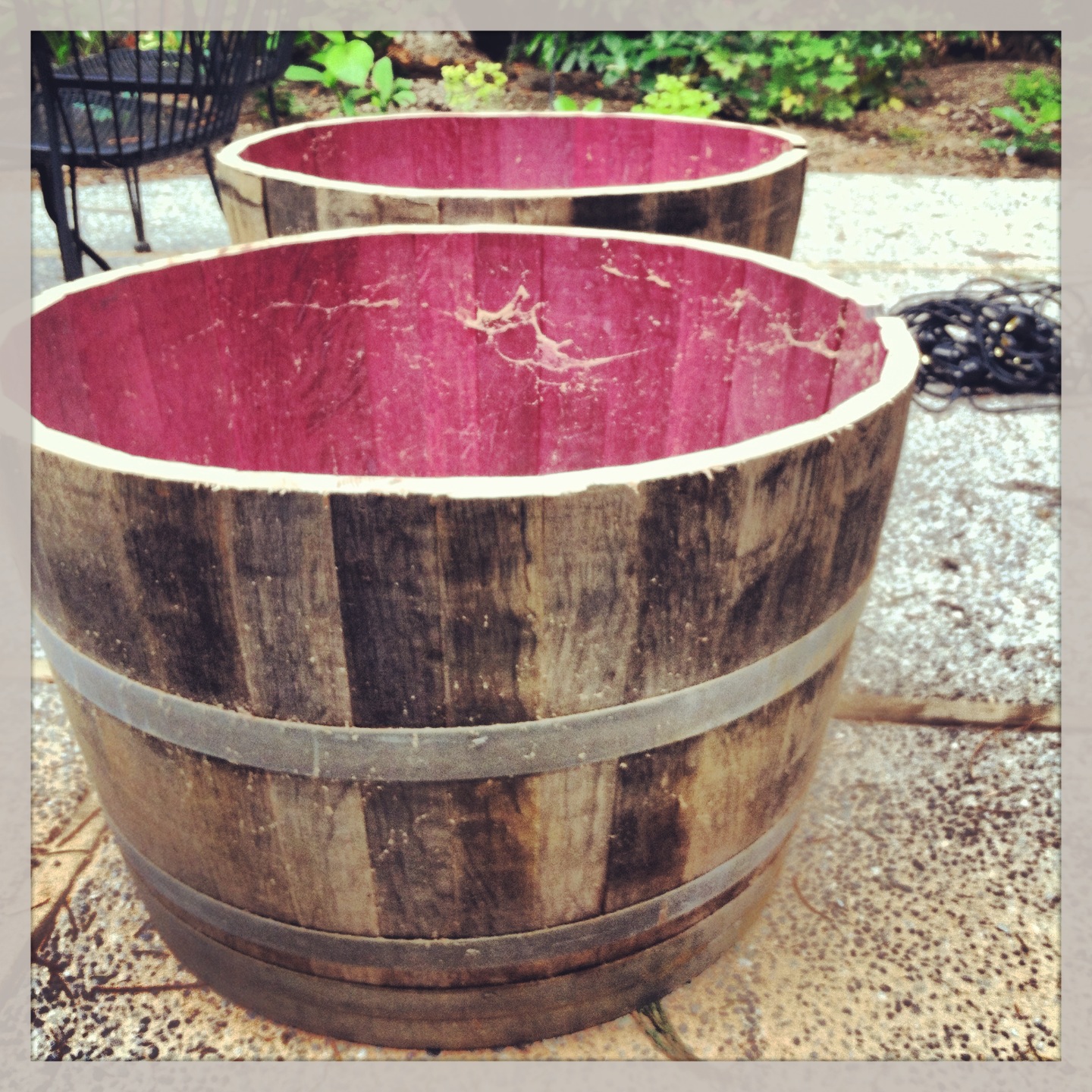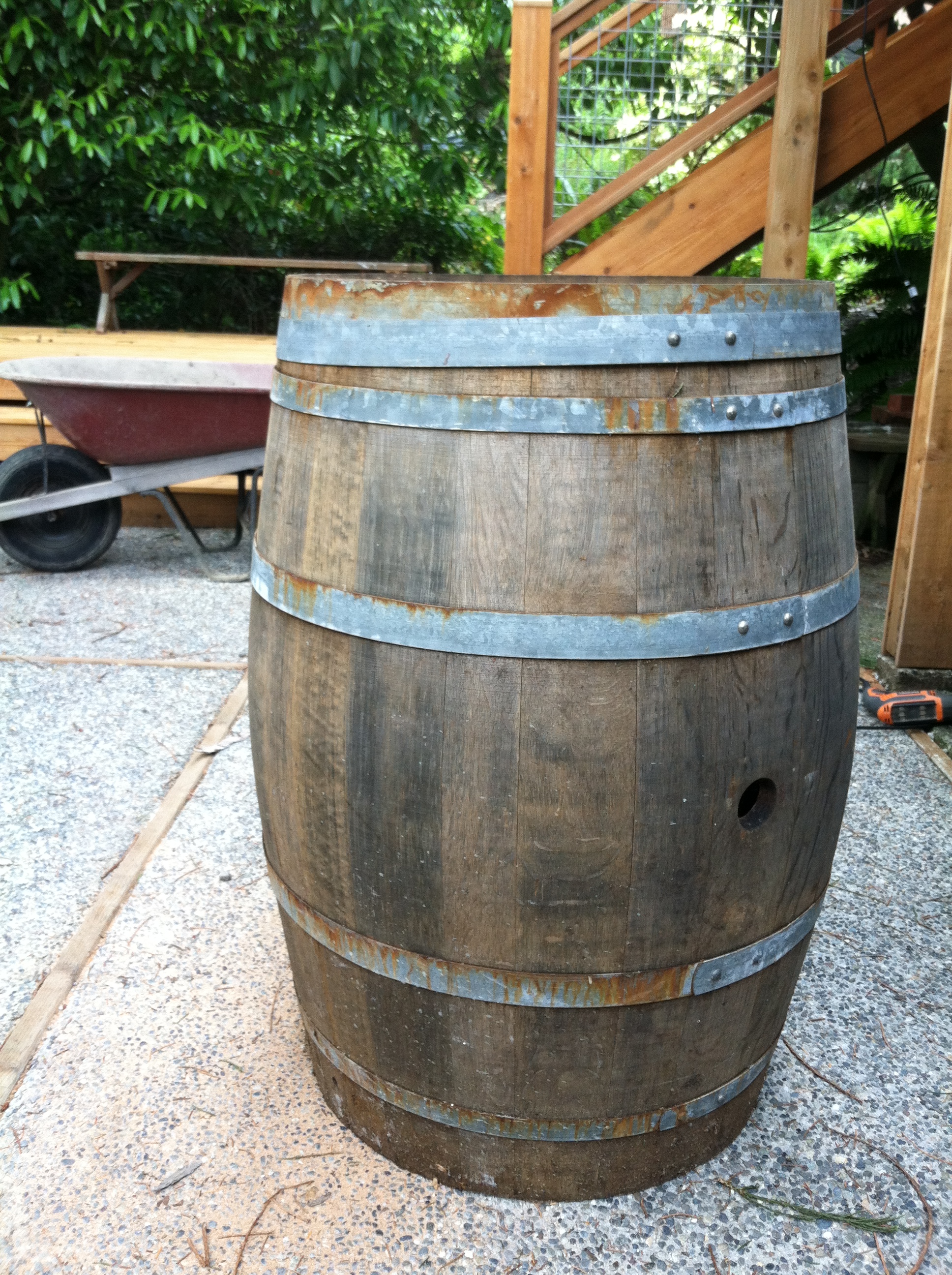 First, buy some wine barrels. We bought two many years ago from Efeste but you should be able to find some at your local winery. We paid $75 for two barrels and borrowed my parents’ Highlander to haul them back to Megan’s Island. What did we do next? We put on the patio and let them sit. For years. Next time I’ll take better care of them, so I have to spend less time cleaning them to get them spiffed up.