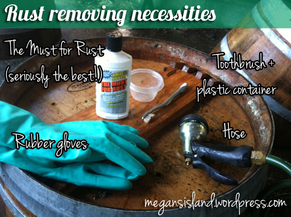 Once the edges were soft-ish and our cut marks were blended in, I started the process of making our aged barrels look brand new. First, I discovered “The Must For Rust,” a solution that truly is the must for rust. This stuff was AMAZING! So amazing, in fact, that I created my first video! Yay! (I’ll figure out how to post the video soon…stand by…)