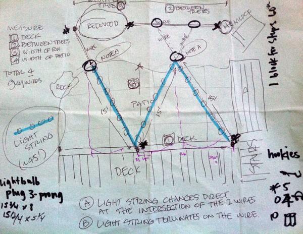 With the materials in hand, my Dad drew a more detailed sketch and we went to Lowe’s to pick up the remaining tools: “S” clips, tighteners, hooks for the deck and tree and an outdoor extension cord.