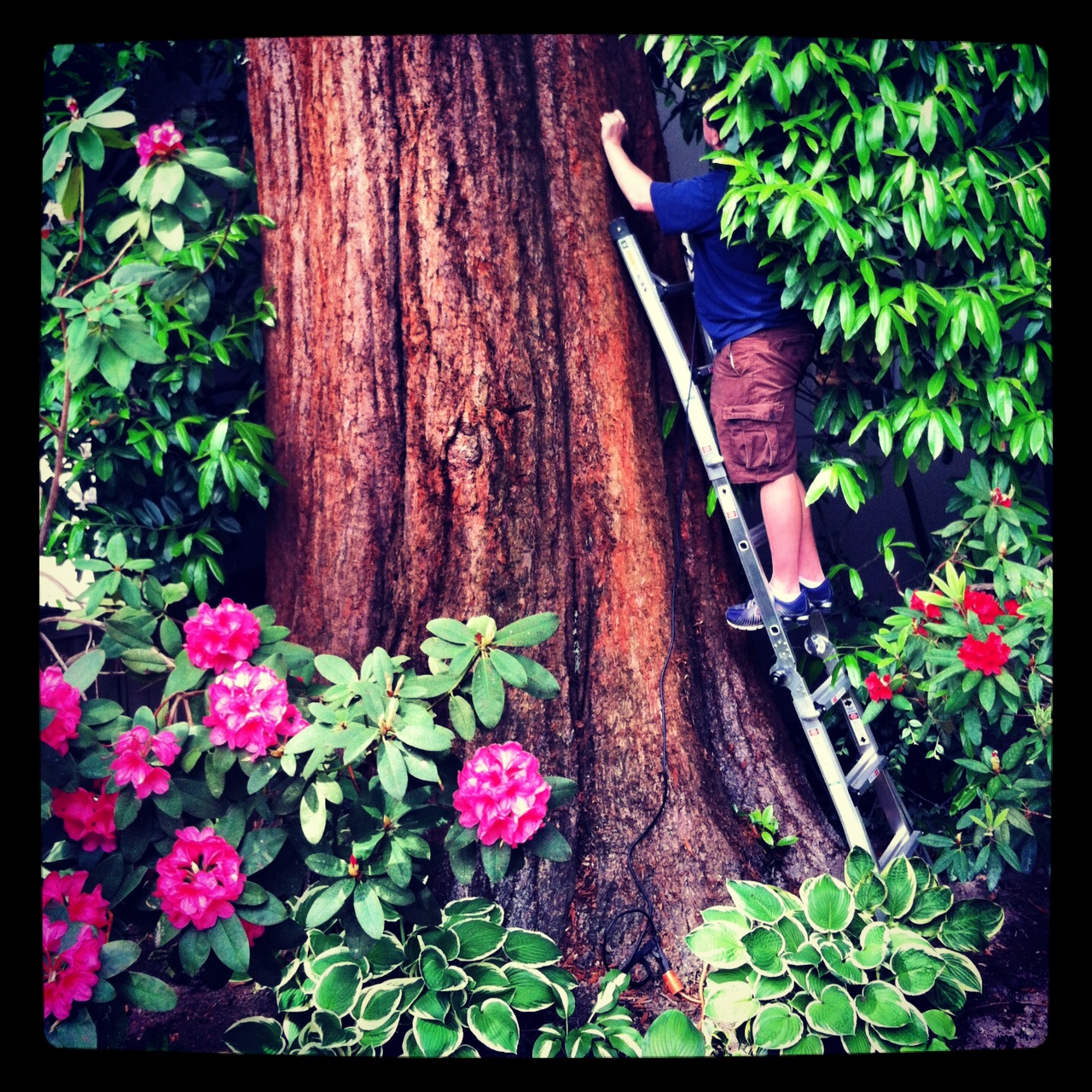 We measured and cut the wires to match the diagram. Then we drilled into the trees and connected the wires. Where’d Brandon go!?