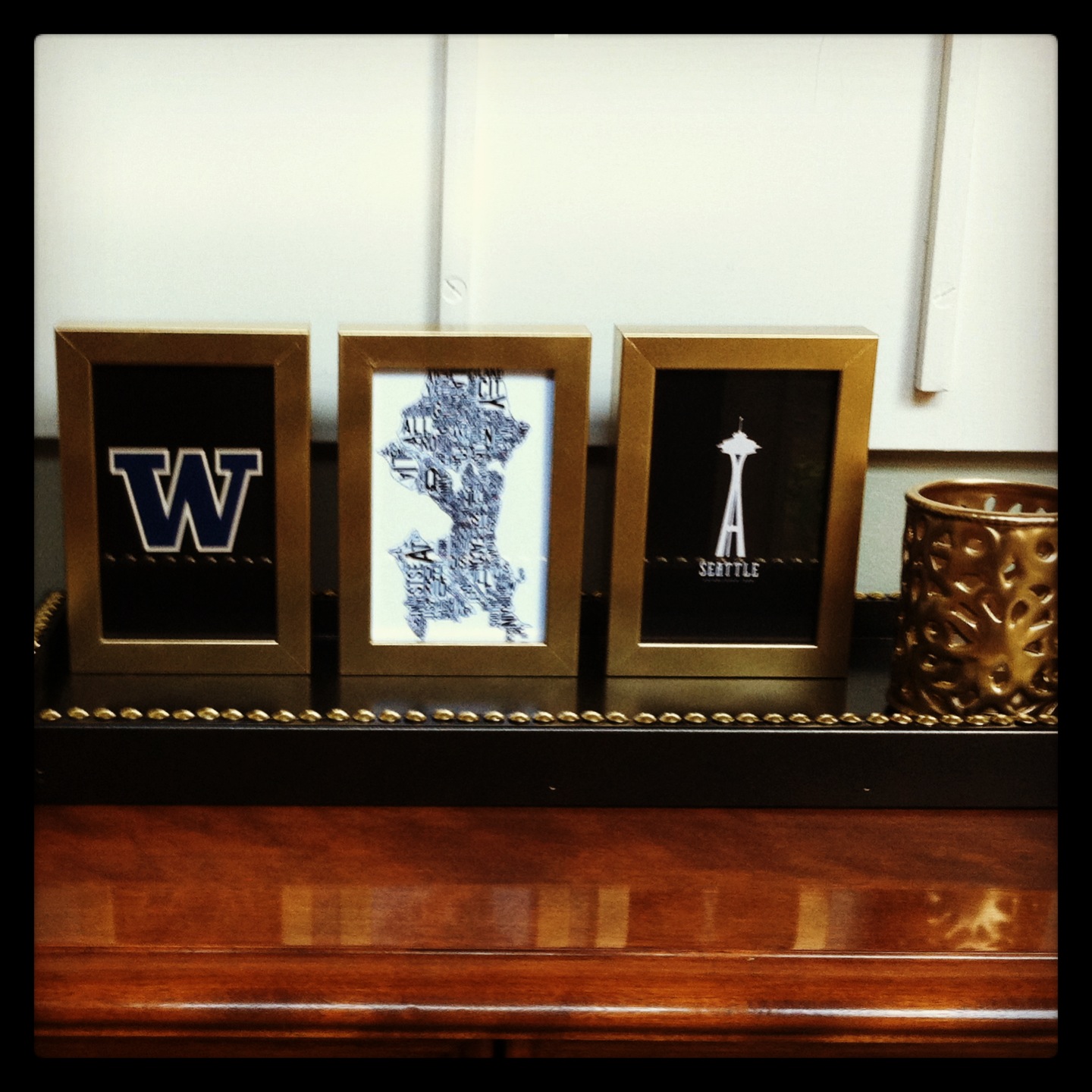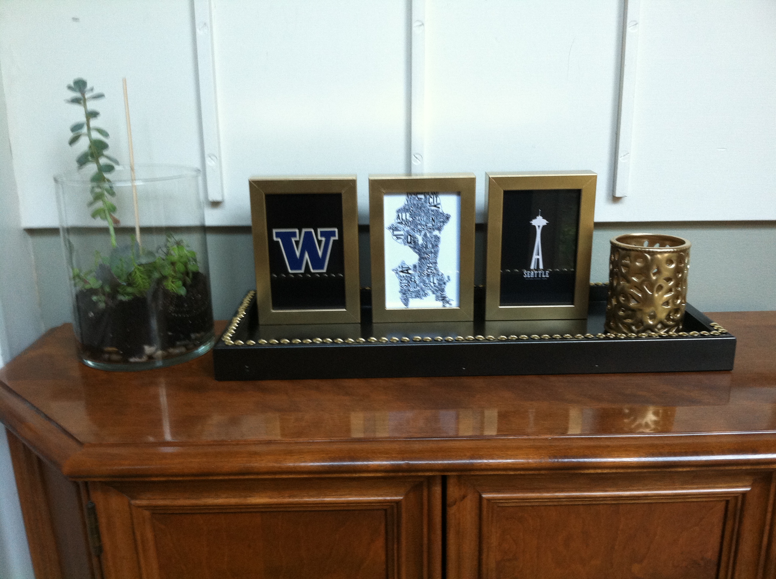 What did I put in the tray? It’s pretty clear in the photo, but I painted a cheap ceramic votive holder that I found on clearance at Michael’s and some grey IKEA 4″ x 6″ ribba frames that I bought thinking they were black. Oops. But they’re prefect for this spot. And now they’re all GOLD. (I have a problem.) I found some fun images online and printed them on cardstock. The images I’ve got now are great, but I plan on switching them out with the seasons and holidays. The tray is just the right width and the three frames and candle holder fit perfectly.