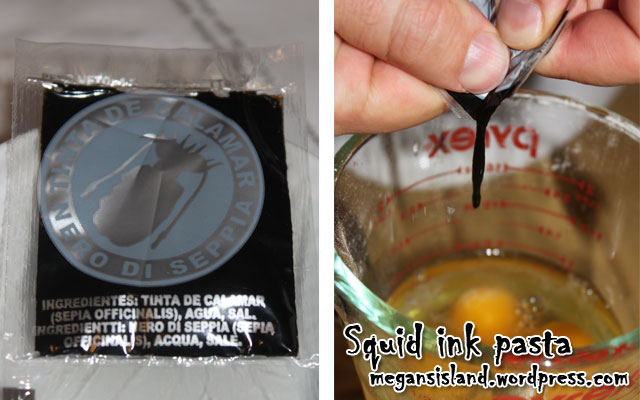 We love making pasta from scratch and used our favorite pasta recipe with a packet of squid ink that we purchased from Big John’s PFI awhile back, two packets for $2.50. There was a 2011 date on the package and Brandon was able to read (in Spanish) that the ink was good for four years beyond that date. So, we tried it.