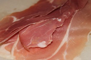 For our first prosciutto meal, I made pizza. First, I took a plain, fresh dough from Trader Joe’s and let it rise, per the instructions. I tossed it a few times and spread it out over cornmeal. I made the pizza sauce by mixing some oil, minced garlic, herbs and tomato paste and added mozzarella, Parmesan, prosciutto (of course!), black olives and some caramelized red onions.