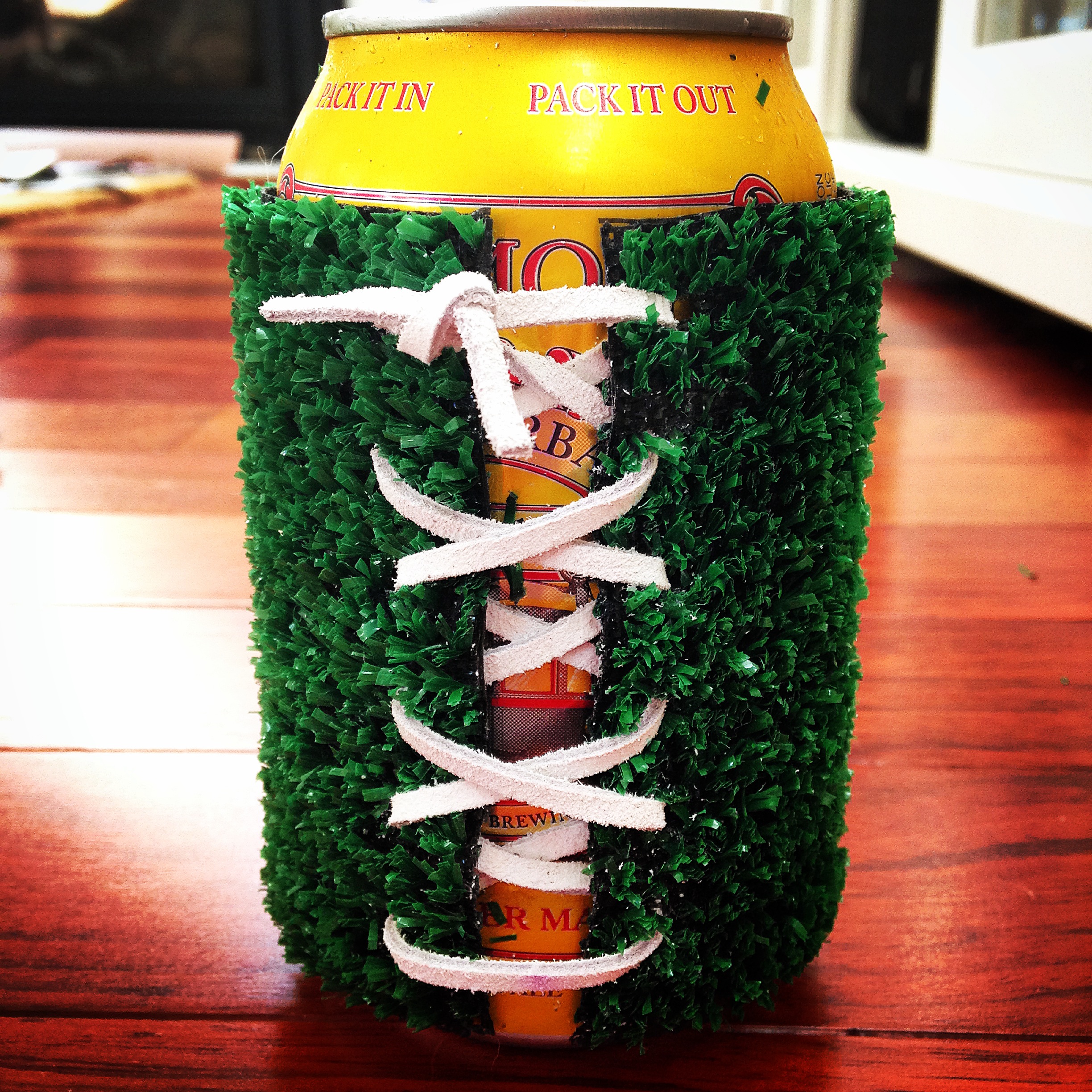 Punch holes in the AstroTurf per the specifications on the template (Design B). Wrap your AstroTurf around the can or bottle to see how much room you need to leave. Cut a long enough (about 4 times the height of your can) strand of laces and thread it through the bottom punches. Pretend it’s a pair of shoes and lace it right up. Finish it on the top with a knot or bow.