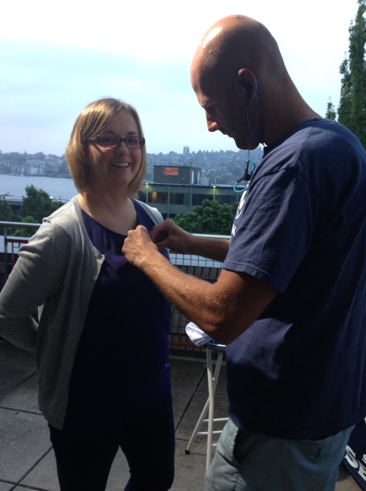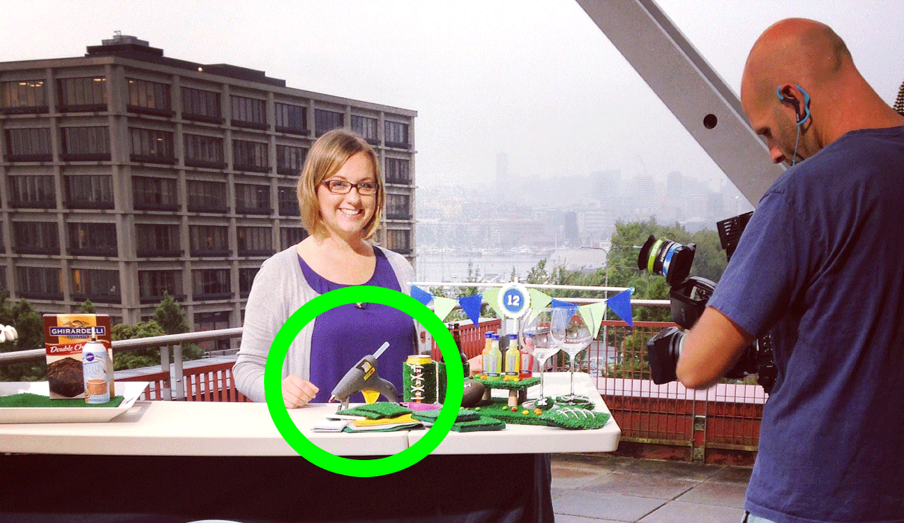 The first comes without a template. Simply cut a shape out of your AstroTurf, punch a hole in it and thread some lace through it. Leave a long enough length that you can tie a bow around your glass. You can use a paint pen or stickers to put an identifier on the shape. I used a “K” for Kaci, the Q13 anchor I spoke to this morning.