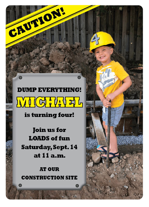 Our invites were amazing — Michael’s construction hat came from Home Depot and I taped on a few layers of foam I cut out. His shirt was from Old Navy. We were lucky to find a torn up parking lot at our swim school: the perfect photo backdrop.