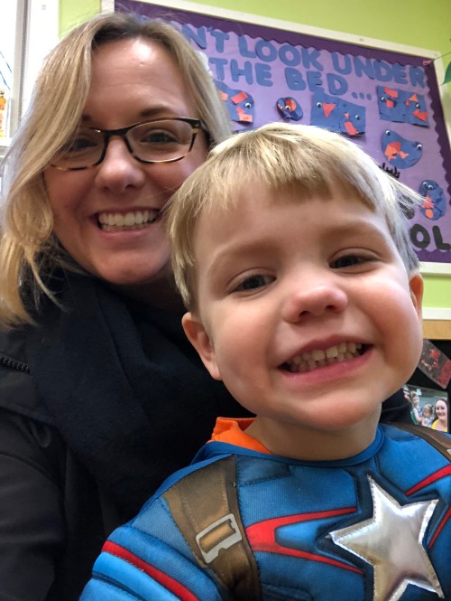 Mater was WAY too big to wear to school for Michael’s class parade, so we pulled this Captain America costume out of the closet. Look at these little super heroes!