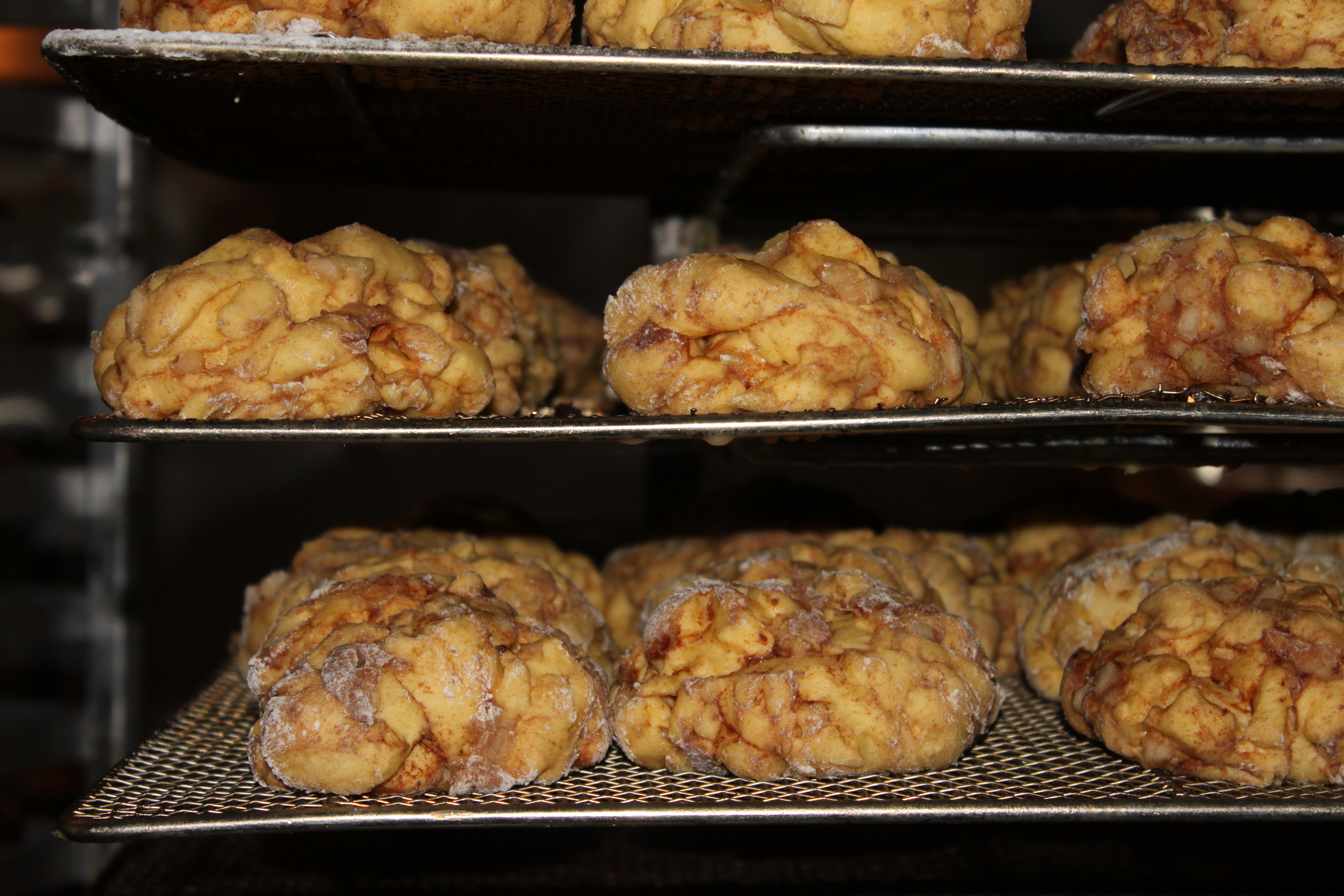Nothing gets wasted in this process. The leftover yeast dough scraps from the bar and circle doughnuts gets combined together to form Top Pot’s famous apple fritters. (One of Brandon’s favorites.)