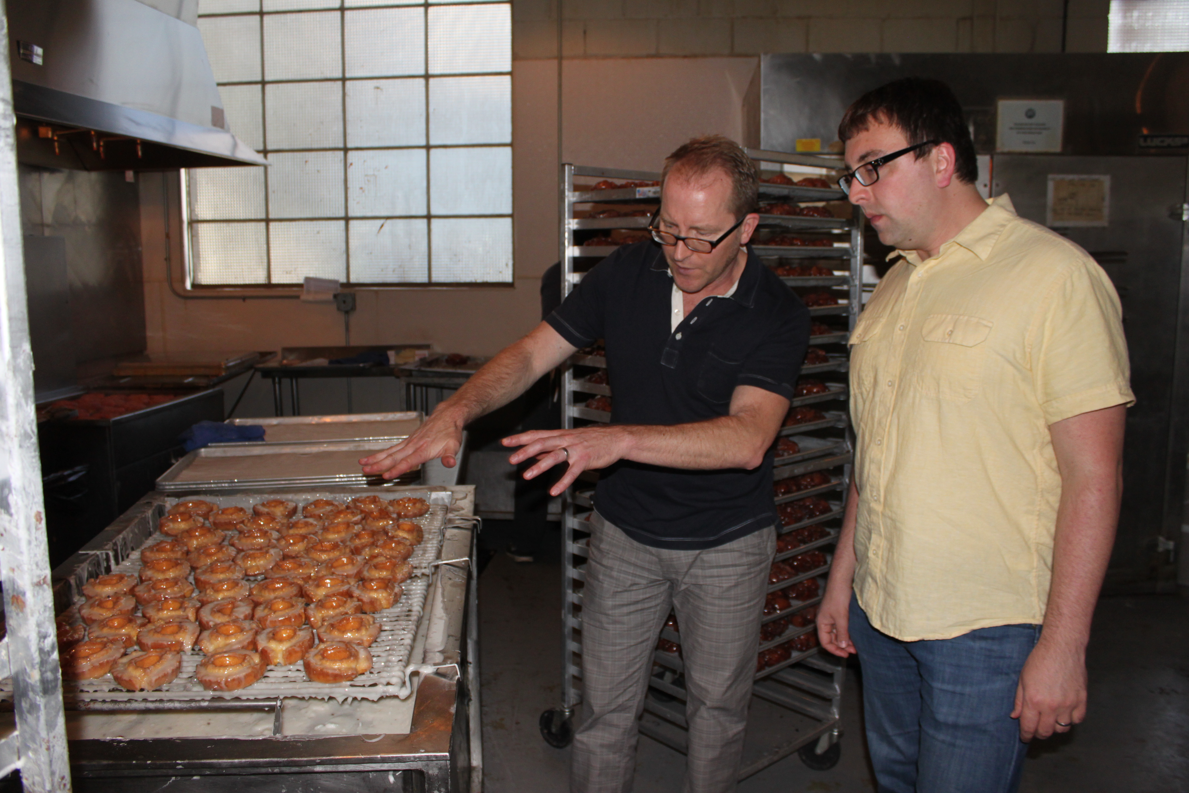 Once cooled, many of the doughnuts (fritters, old-fashioned, etc…) get glazed. The glaze-r is so cool. The doughnuts are placed in a single layer on their wire rack and the whole rack makes its way to the glaze table. Then this trough gets filled with glaze and the doughnut maker covers the whole rack in a swift motion: