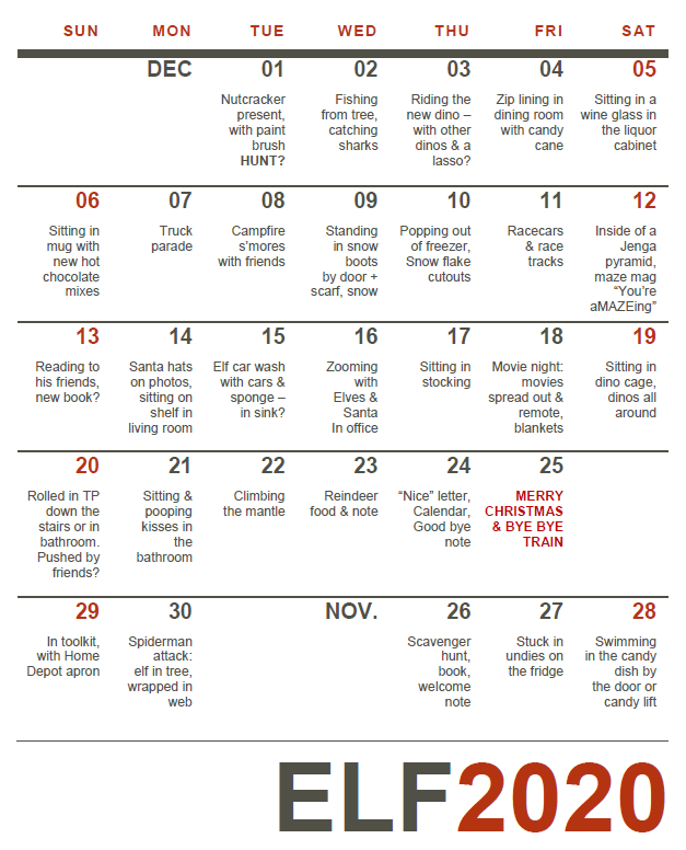 We found the secret to actually enjoying your elf is to pre-plan the poses, so you don’t have to think on your feet. We do this by creating a calendar. While we deviate from the calendar on occasion, it’s so useful to have an idea ready to go. We’re four days in and have deviated twice, which is fine by us. Michael doesn’t know any different.
