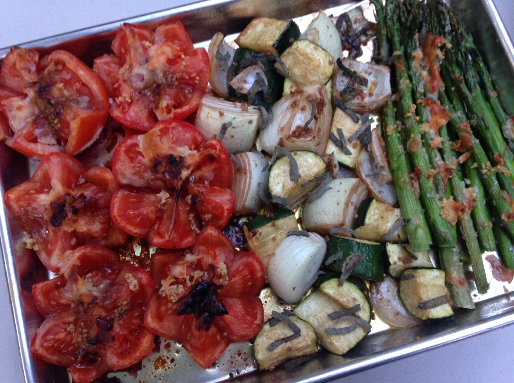 We started with a trip to the Pike Place Market and QFC to pick up our supplies: Uli’s sausages (French Onion, heavy garlic chicken, and mild Italian), a sweet onion, zucchini, tomatoes, asparagus, a pork chop, and a seasoned flat iron steak. Dicing here, chopping there and voila! We had our veggies ready to roast and our skewers skewered!