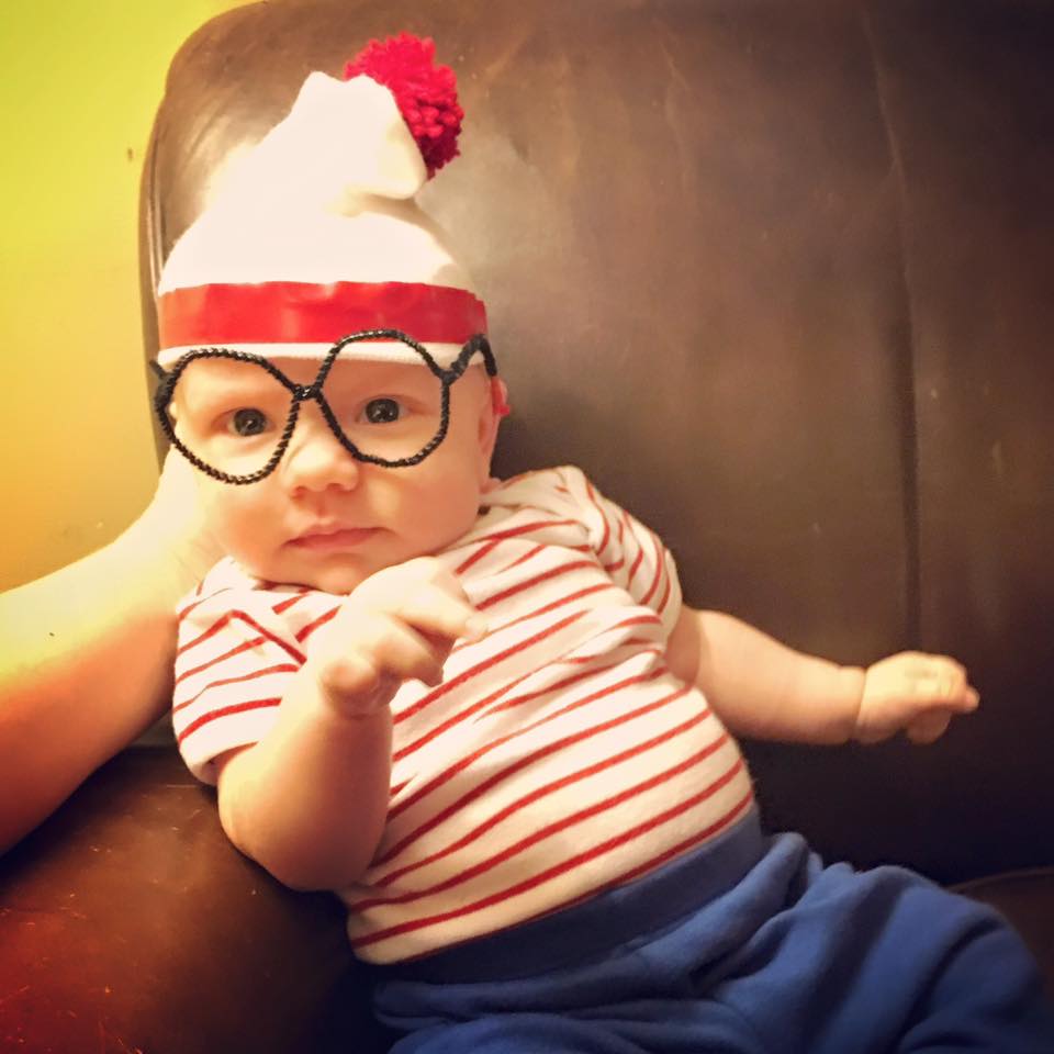 Finally, his Waldo outfit came together by happenstance. I was going through Michael’s outfits, saw the red and white striped onesie and his blue pants and voila! I added a red electrical tape stripe to his hat from the hospital, along with a yarn puff. The only item I needed to purchase were pipe cleaners for his glasses. $1 total. Cheapest– and cutest– costume yet!
