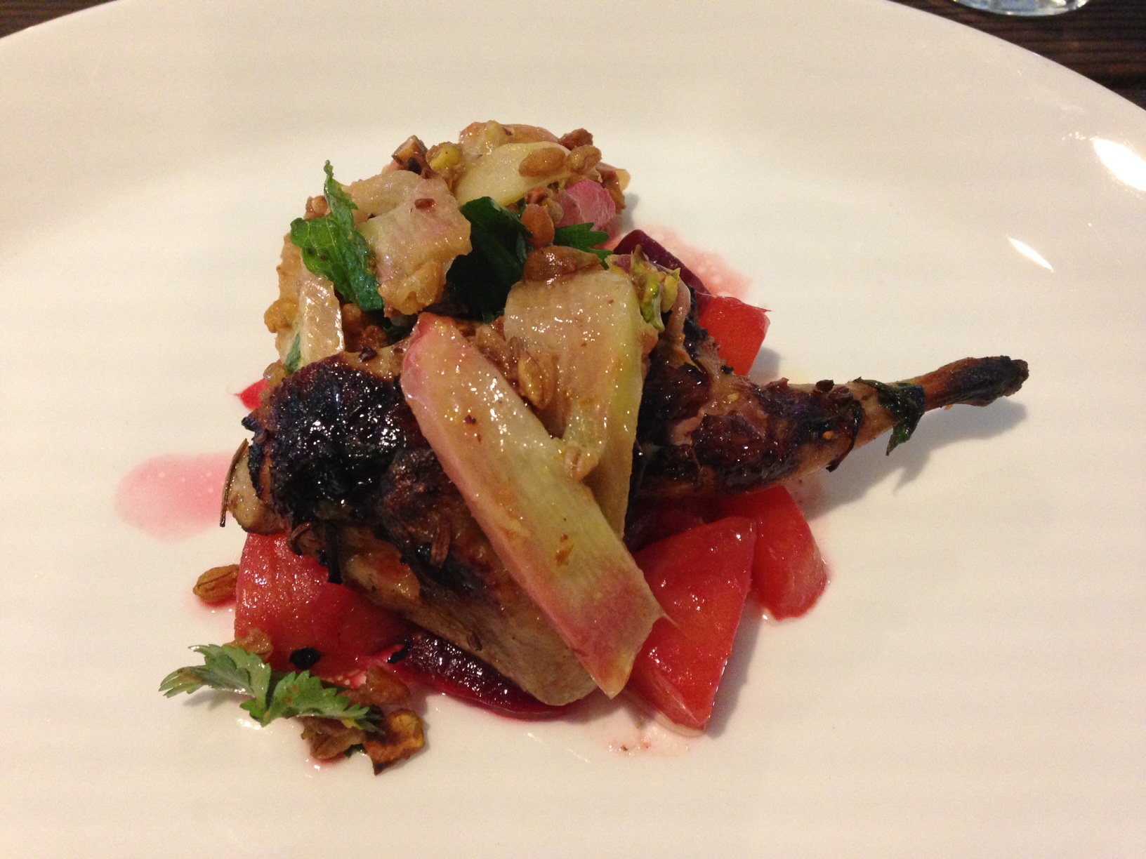 The third course, one half of a roasted quail, beets and rhubarb with crispy emmer, pistachios and mint was paired with the 2012 Zinfandel Maple Vineyard. The Zin was good, but it wasn’t my favorite. Brandon, however, really enjoyed it.